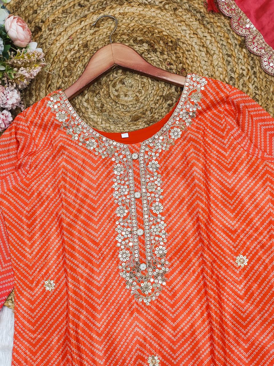 Bandhani print traditional chinnon silk kurta pant with dupatta sets