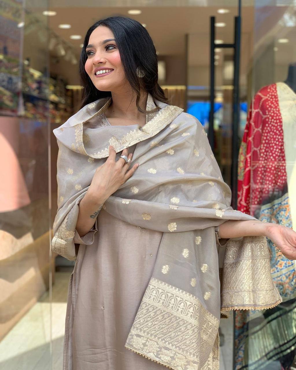 - Dupatta Fabric: The Dupatta is crafted from heavy jacquard fabric with weaving chandery fabric and detailed zari work, enhancing its grace and charm.