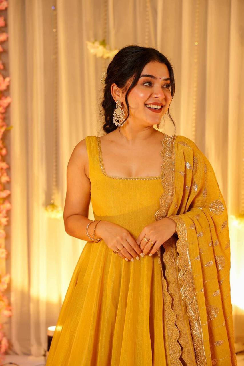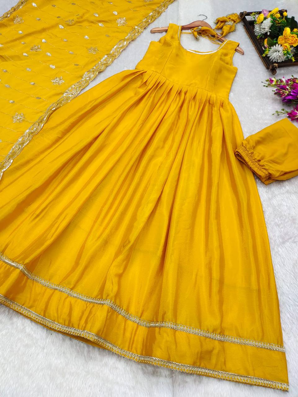 Chinnon silk fabric haldi function wear dress for women,Heavy Gown pant with dupatta sets