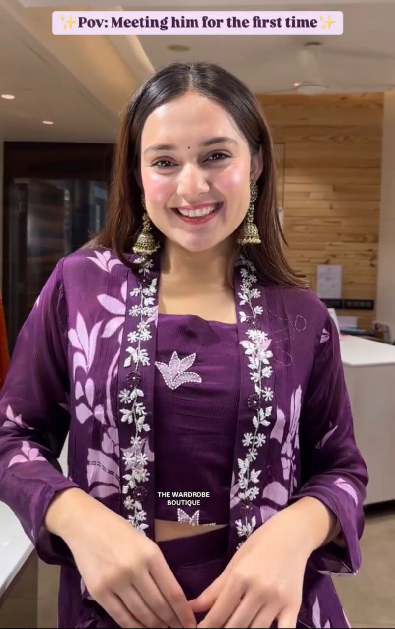 “Elegant Chinon Plazzo Set with Embroidered Koti & Stitched Blouse”