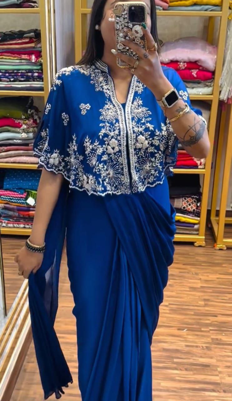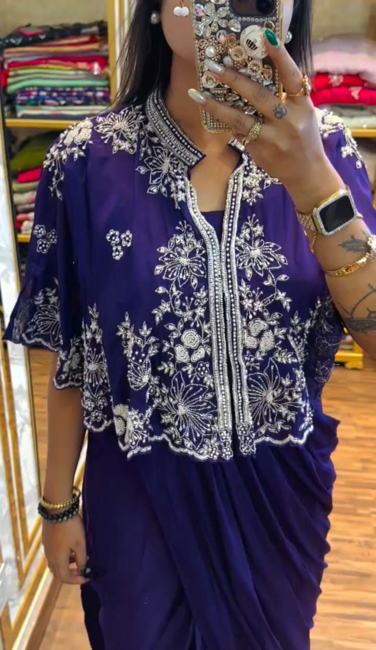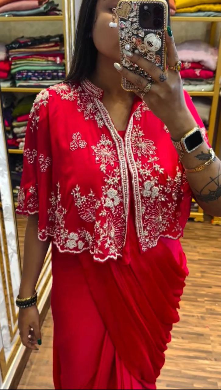 "Elegant Heavy Chinon Gown with Embroidered Shrug"