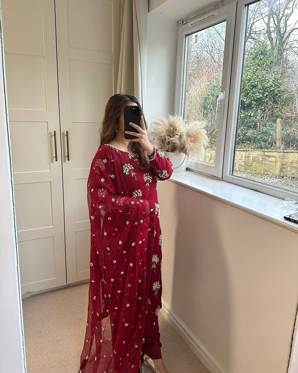 "Elegant Heavy Chinon Long Top with Embroidered Dupatta & Stitched Pant Set"