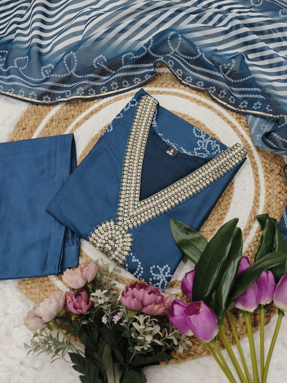 "Elegant Pure Rayon Embroidered Kurti Set with Taby Silk Dupatta – Orange & Blue"