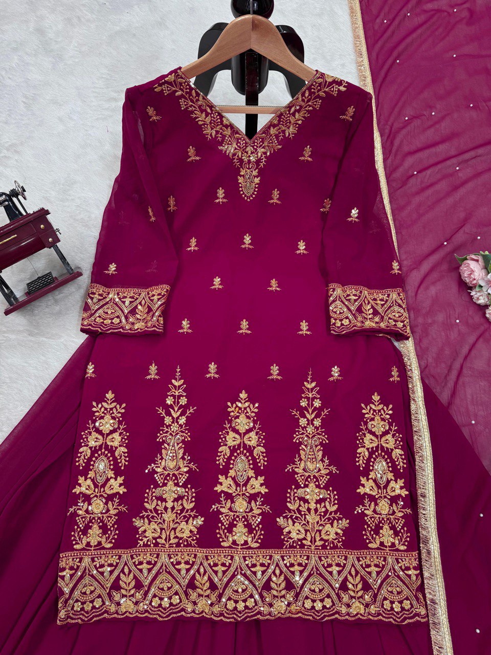 "Foux Gorgette Elegance: Embroidered Top, Plazo & Dupatta Set"