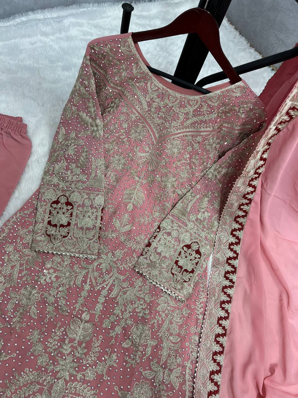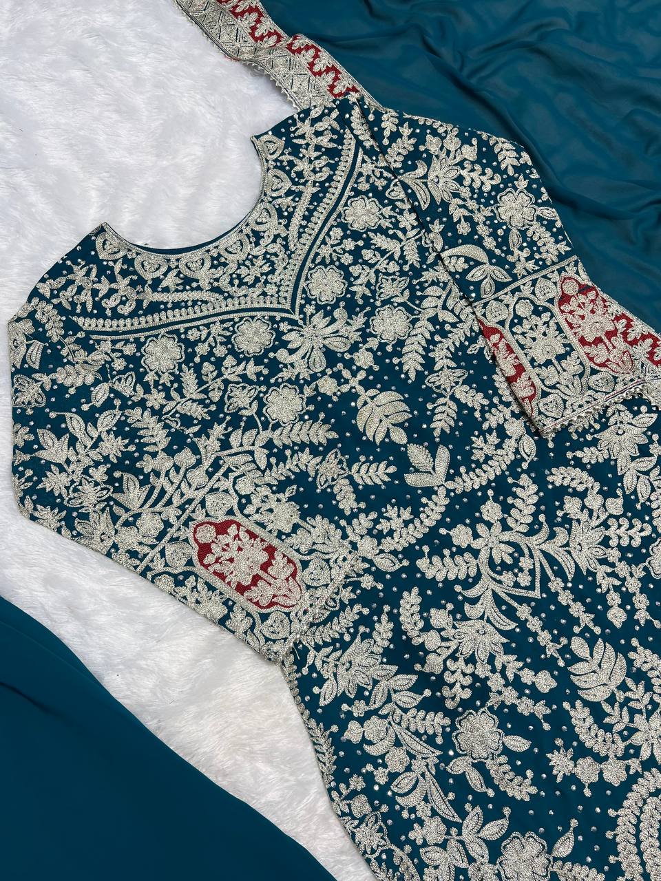 - Fabric: Heavy Faux Georgette with heavy embroidery work and diamond handwork, featuring full sleeves for a graceful look.