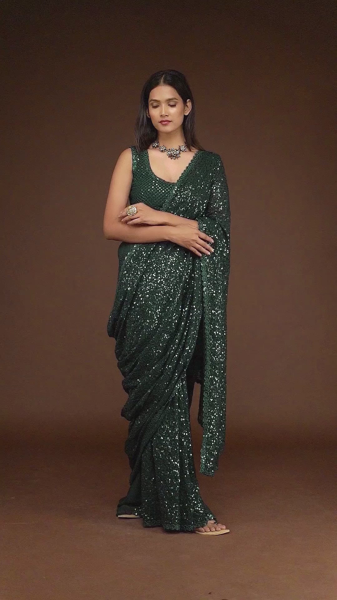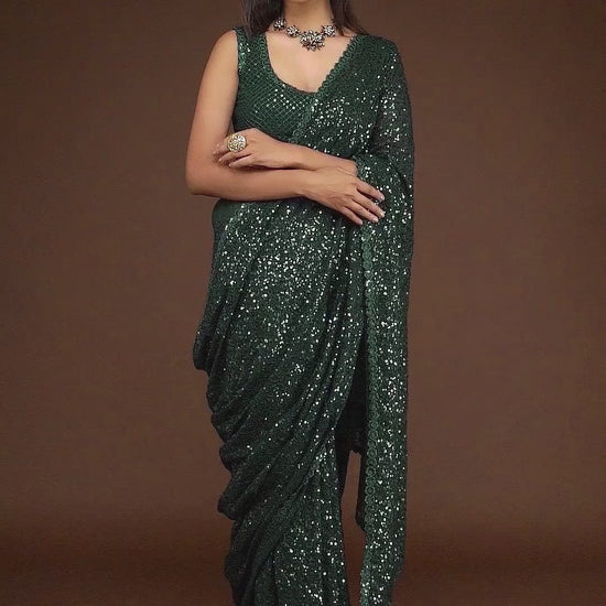 Sequins Work Traditional Saree For Festival In Bottle Green