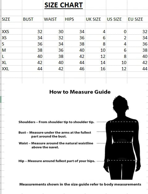 | Size | Bust (inches) | Waist (inches) | Hips (inches) |